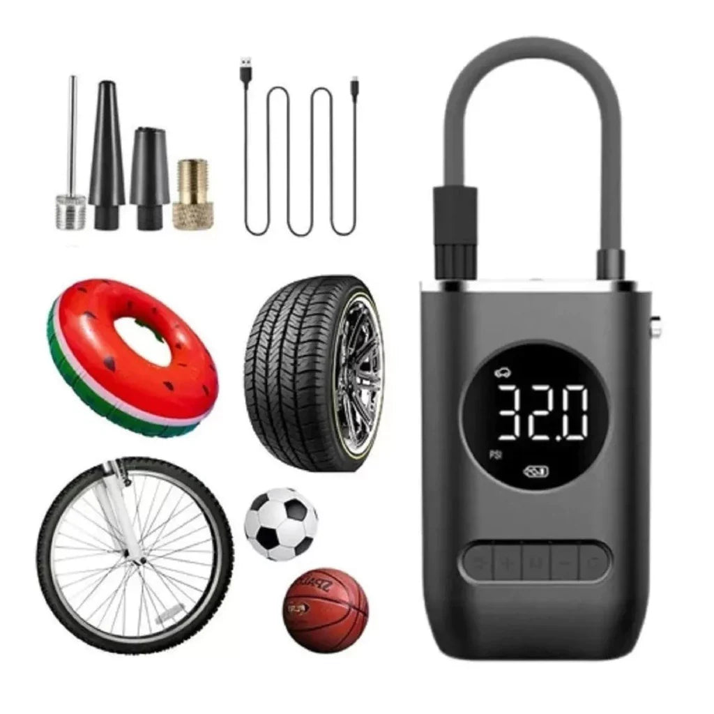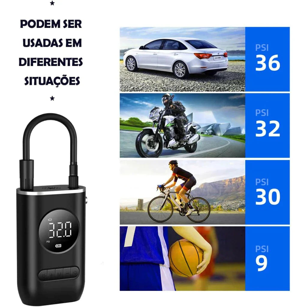 Ele enche pneus de carro, moto, bicicleta e até bolas — tudo isso em um corpo compacto, leve e portátil.