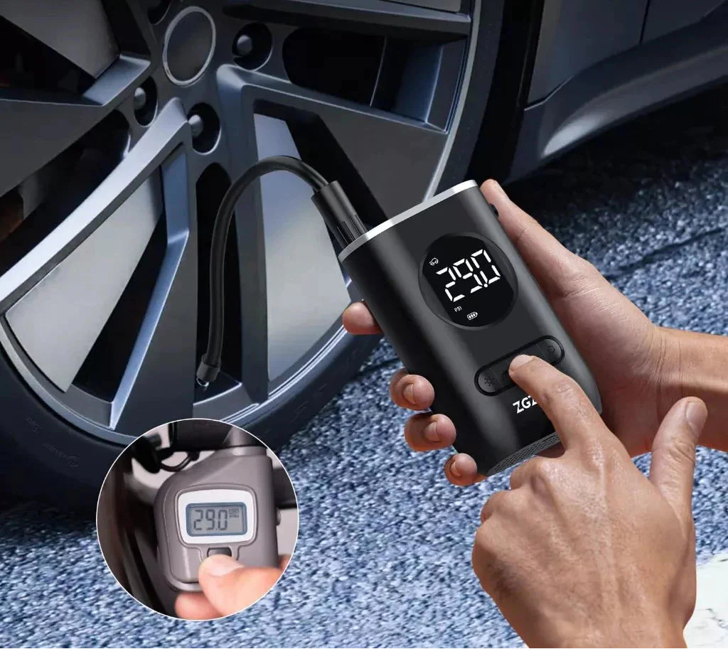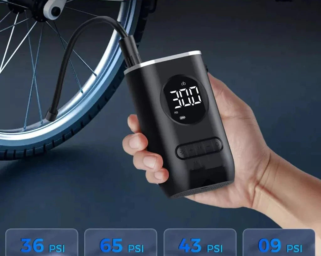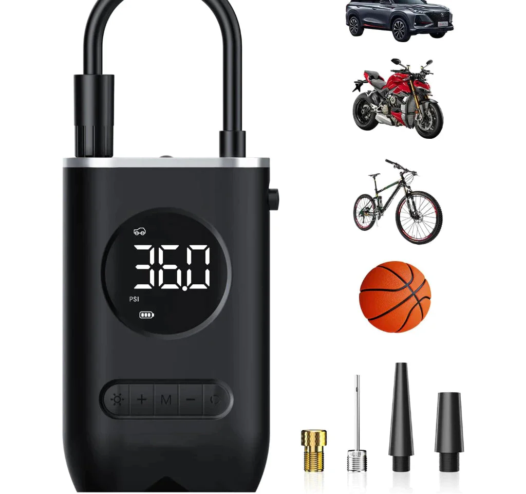 O Mini Compressor de Ar Portátil Recarregável Digital USB cabe no porta-luvas, na mochila ou no armário — e resolve tudo em minutos.